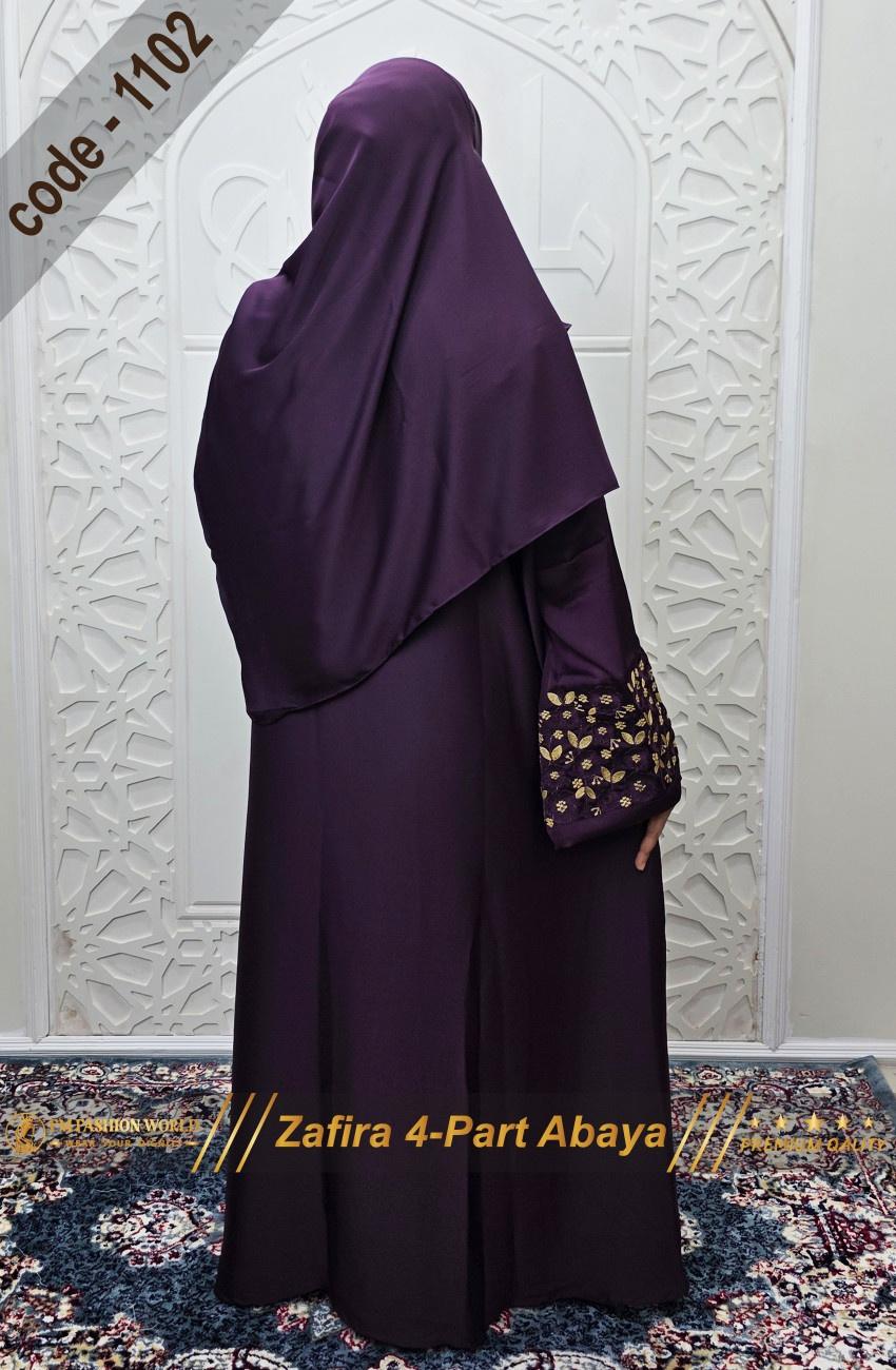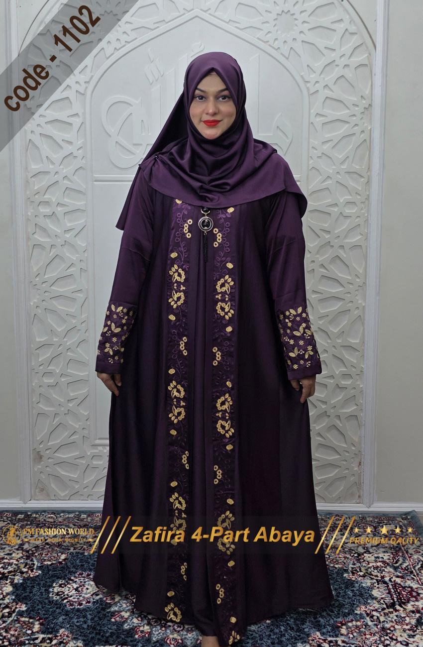 Zafira Imperial 4-Part Abaya is made from premium Zafran luxury fabric with heavy golden embroidery. Available in 5 premium colors and sizes 50–56, with 100% color guarantee and premium finishing.